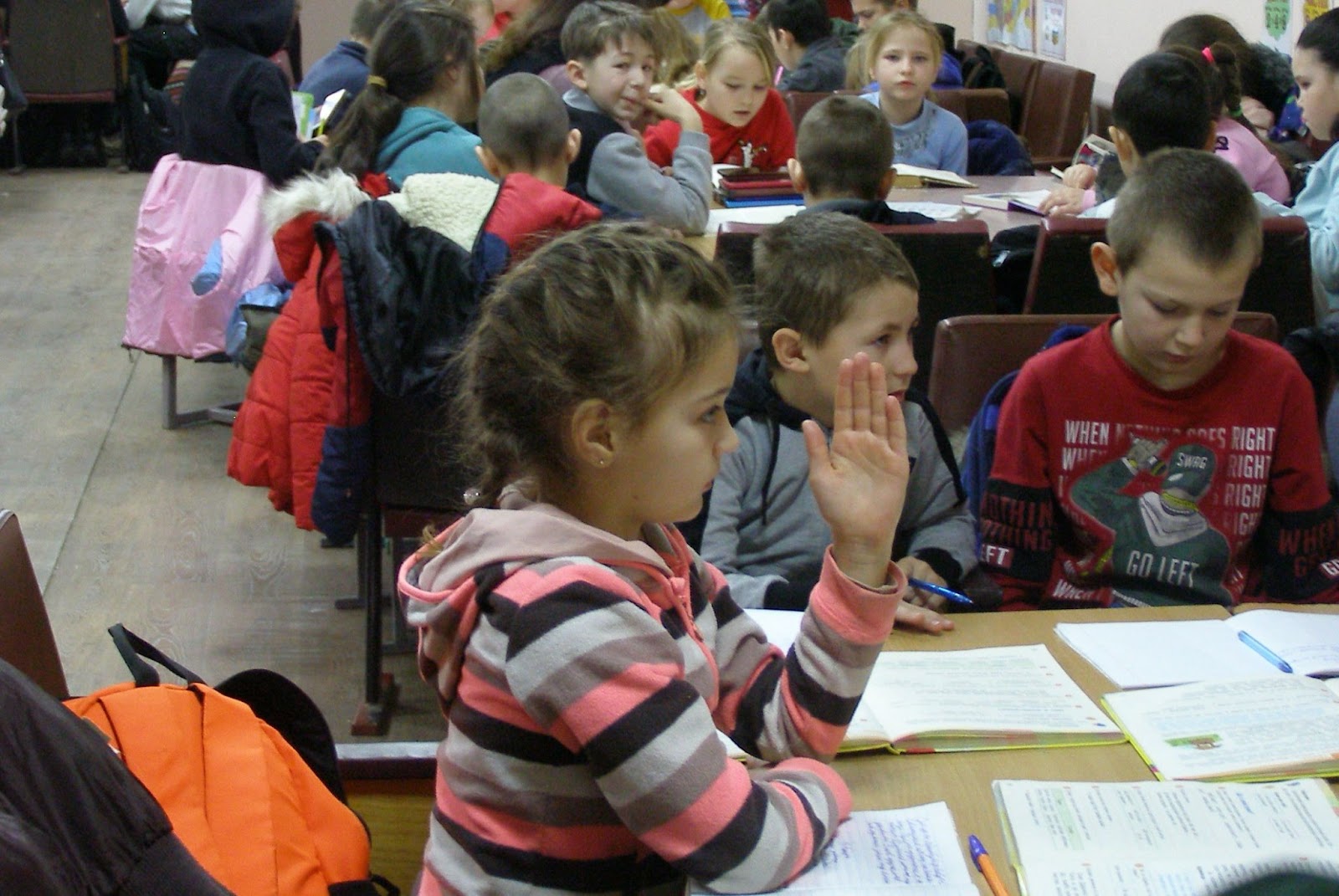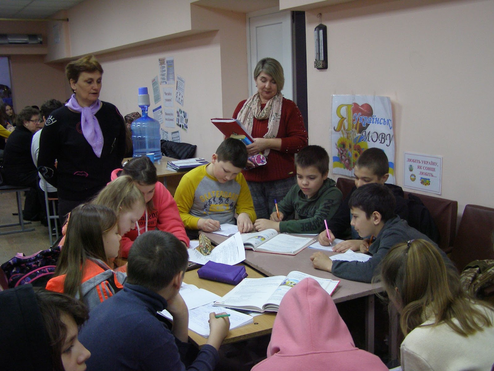 Воздушной тревоги не приходится долго ждать. Спускаемся в укрытие, где дети уже разместились и продолжаются уроки. Все одиннадцать классов – в одной комнате. Общение только по теме и только вполголоса. Одно из несомненных преимуществ небольшого дружного школьного коллектива в возможности так организовать обучение. Каждый класс тесно разместился рядом со своим учителем, для чего сдвинули несколько столов.